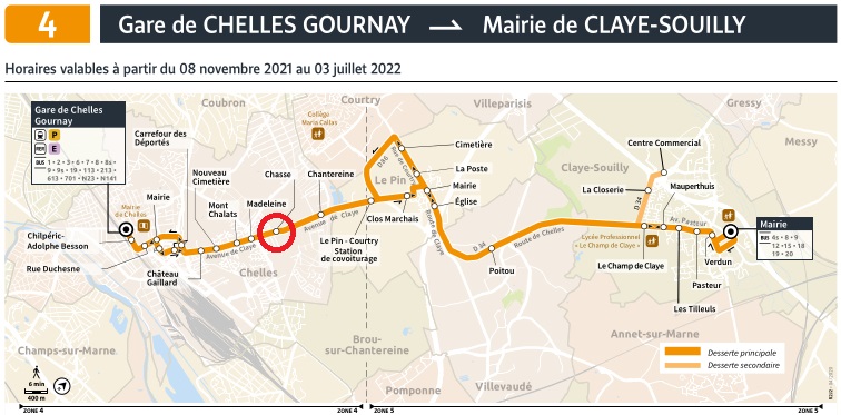 Pour plus d'information et obtenir les horaires et correspondances avec le RER E à Chelles-Gournay vous pouvez consulter le site : https://www.transdev-idf.com/plan-et-horaires/chelles